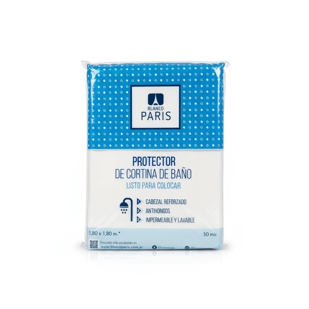 Protector para cortina de baño con proceso antiestático y antihongo Cabezal reforzado, en color blanco. Medidas: 1.80mts x 1.80mts